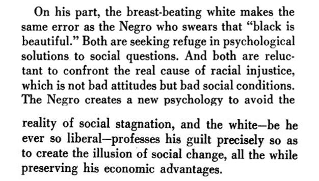 “If he [a black worker] defines the problem as primarily one of race, he will inevitably find himself the ally of the white capitalist against the white worker. But if, though always conscious of the play of racial discrimination, he defines the problem as one of poverty, he will be aligned with the white worker against management. If he chooses the former alternative, he will become no more than a pawn in the game of divide-and-conquer played by, and for the benefit, management.”