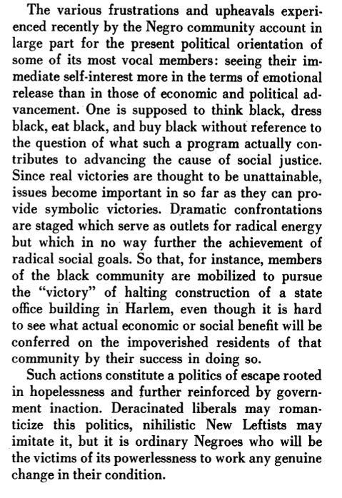 Rustin’s entire essay is a treasure trove of insights and observations that have, unfortunately, only become more true with the passage of time. For example, he argues that racially targeted reparations is a losing proposition in a country populated by poor folks of every skin color. He even finds time to take issue with the debasement of higher learning in the service of a (supposedly) revolutionary political agenda. We see this today at universities that sacrifice academic rigour, critical discourse and freedom of speech, to the dictates of woke orthodoxy.