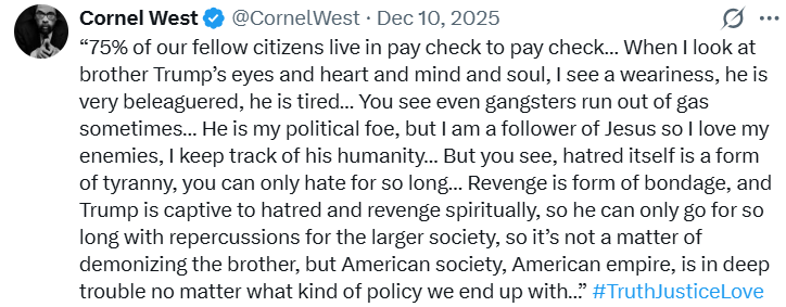 I can’t control what people say or how they say it — on this I agree with my critics on the limits of my project. But I’m not going to amplify content that personally demeans or debases anyone and I mean anyone, even ICE agents, even Trump. I can be relentless in my criticism of their actions and ideas, yet avoid making demeaning broadsides or relishing their suffering. As I’ve heard Cornel West say many a time, “Go hard on structures, soft on people.”